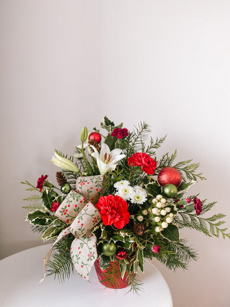 An upright Christmas arrangement in classic colours decked with bobbles, pine cones, and a bow with long lasting red and white florals in a sparkling pot.