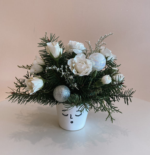 This sweet arrangement may be small in size, but it boasts a big dose of holiday cheer! With this adorable mix of spray roses, mini carnations, and decorative ornaments, choose your pot and send a little Ho, Ho, Ho!