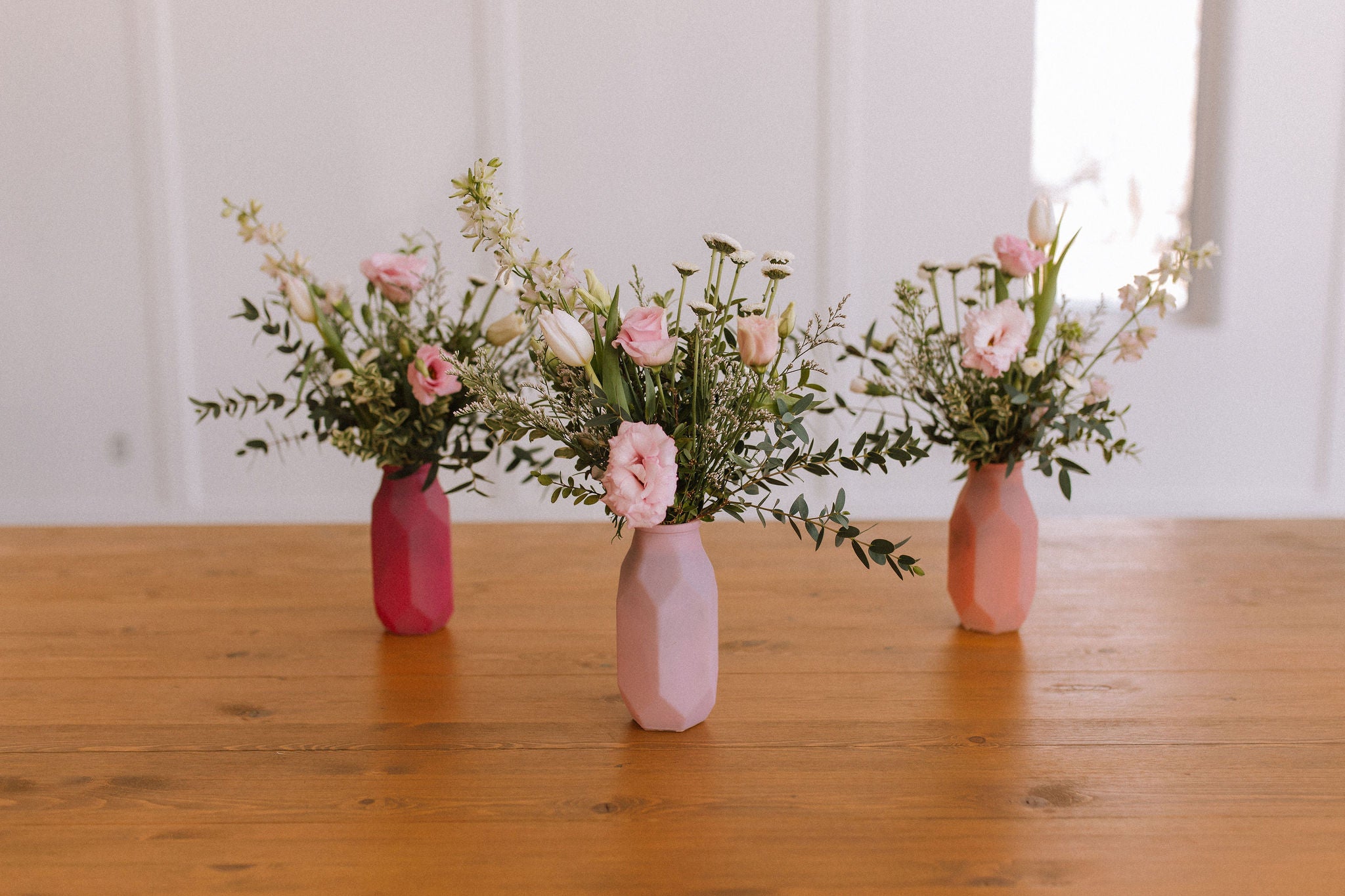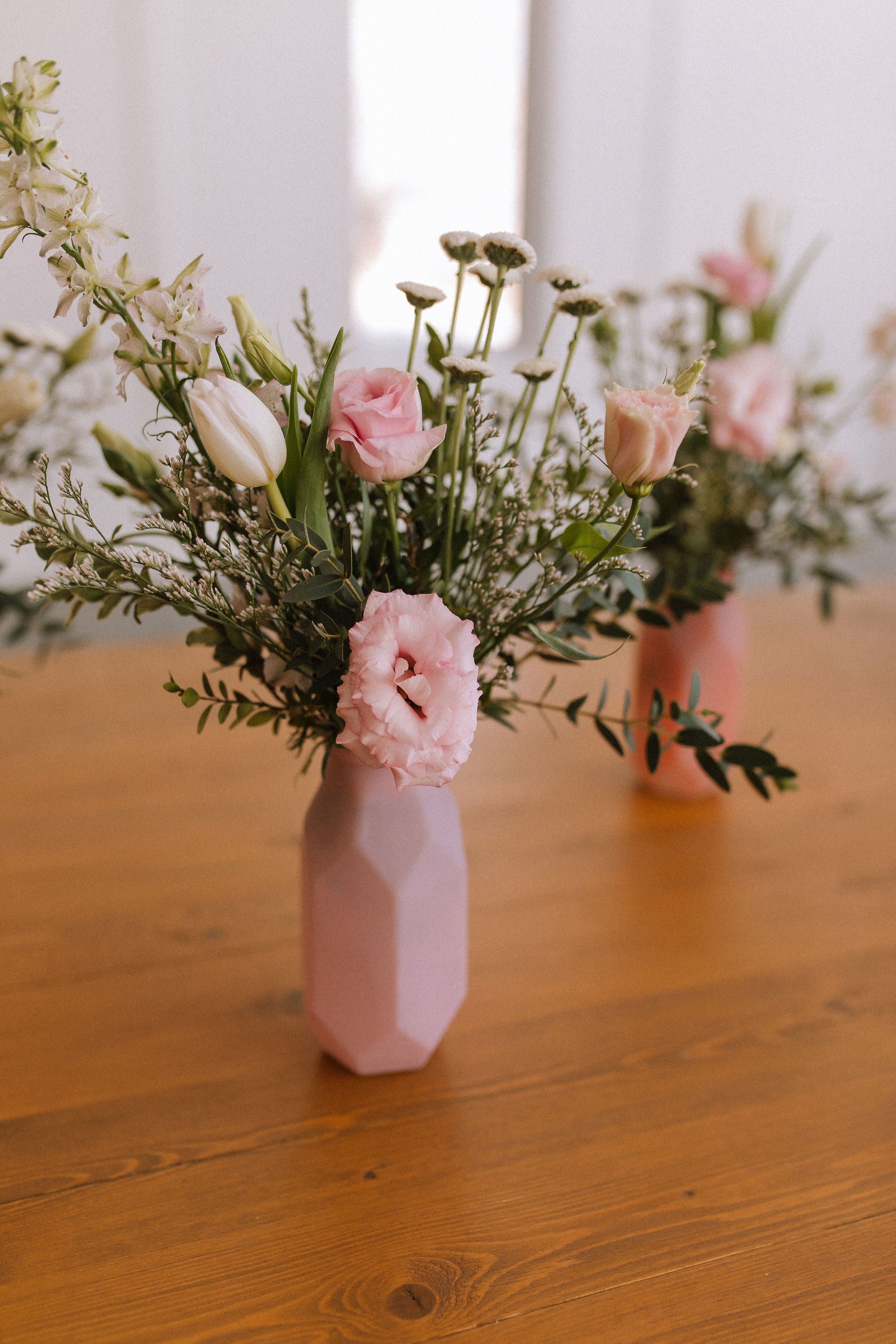 Soft white and blush flowers arranged in a charming and stylish vase! Vase colour options are peach, bright pink and light pink.
