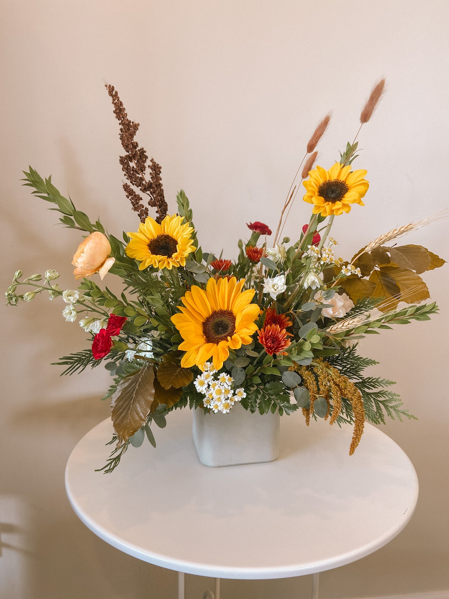 Shown standard size with sunflowers, fall mums, ranunculus, larkspur, carnations, and seasonal texture accents. Variations may occur depending on availability. Order at least one week in advance for best match.